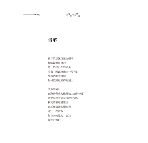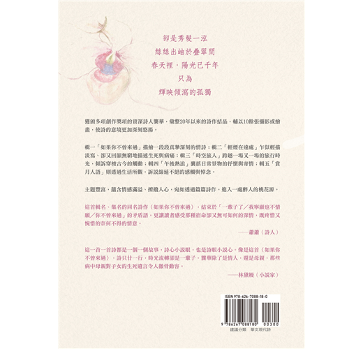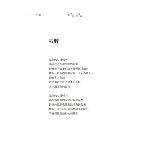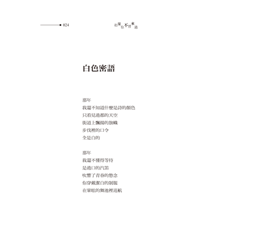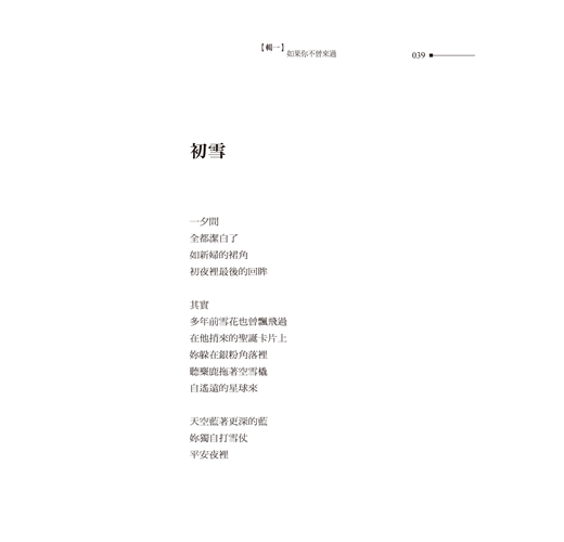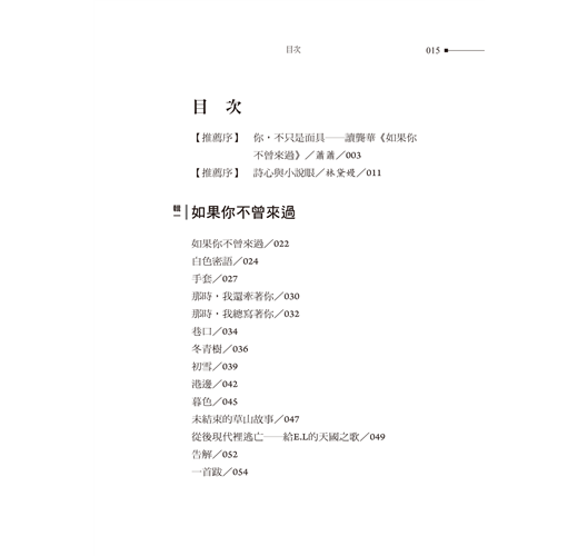 這本詩稿我反覆推敲、不斷琢磨,以讀長篇小說的慣性,努力解構一行一行的詩句,讀著讀著,豁然開朗,不免怨怪自己繞了遠路,浪費那麼多力氣,其實這一首一首詩都是一個一個故事,詩心小說眼,也是詩眼小說心。像是這首〈如果你不曾來過〉,詩只廿一行,時光流轉卻是一輩子,順著女子的生命軌跡,緊接著〈公車票〉、〈白色密語〉、〈手套〉、〈那時我總寫著你〉……