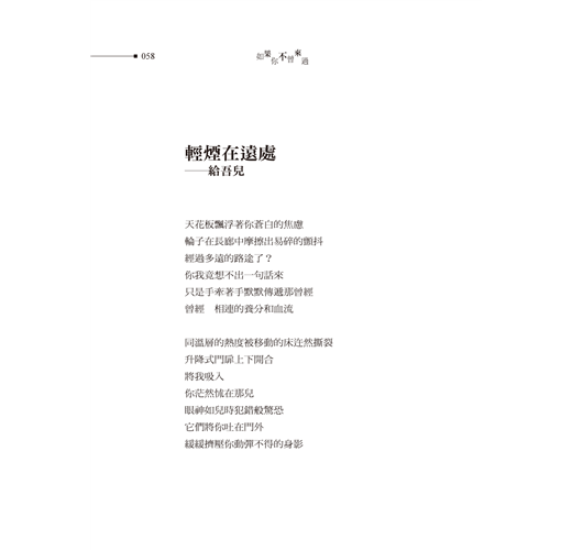 不知聽誰說過,大部分詩人的詩都是情詩,不過在《如果你不曾來過》裡,龔華除了是情人,還是母親,那些病中母親對子女的生死遺言令人徹骨動容。躺在病床上要進開刀房的母親,若能安然度過今天,走入成為今天的明天,那麼就可以獲得一枚上天頒發的勳章。除了檢視自己蒼白的身軀任人畫符,病人母親也努力從眼縫中辨視那和自己臍帶相連而今已然長大的身影,只要闔上眼,身體腫脹的勞苦可以安息,所有的痛苦也都會終止,但母親病人即使昏眼朦朧也要和孩子的視線緊緊相連。