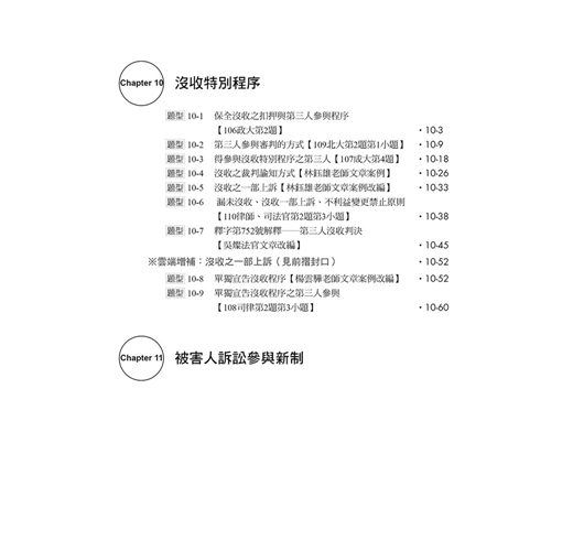 ⑶ 也有新增一些文章、教科書案例(前面有些其實也是啦),幫大家補充一些重要的文獻、實務意見,其中也有部分把舊解換成「有在考試上出現的題目」重解一次,例如:題型1-1-1強制處分專庭、題型1-1-3媒體預斷與法官迴避、題型3-2-2沒收扣押與證據扣押的爭議、題型8-1-1監護處分與無罪判決之上訴利益、題型10-4沒收裁判諭知方式、題型10-5沒收之一部上訴等。