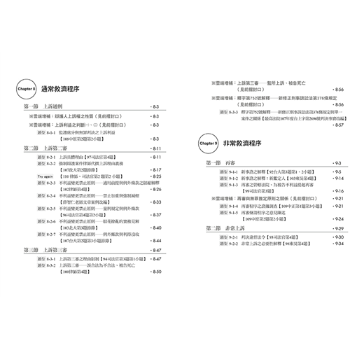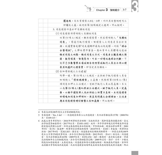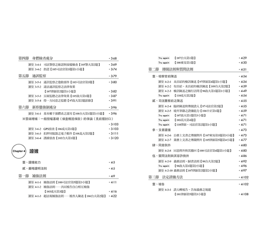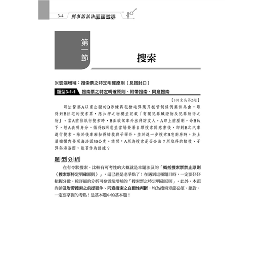 ⑵ 有多收錄了一些涉及「基本概念」的題型,例如:題型3-3-1拘捕前置原則、題型3-3-6限制出境出海、題型3-4-1司法警察之身體檢查處分、題型9-1-2新鑑定人之新事證、題型9-1-5再審聲請程序之意見陳述等,其中身體檢查與限制出境,近期有一些新文章與討論,所以更有收錄必要。