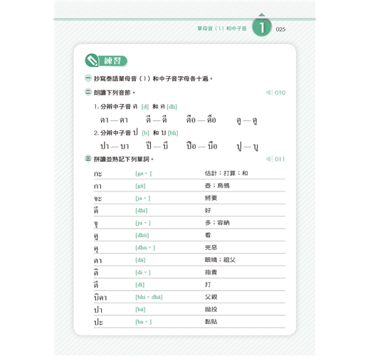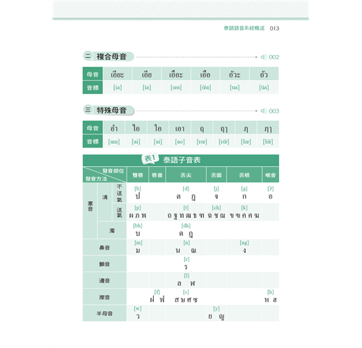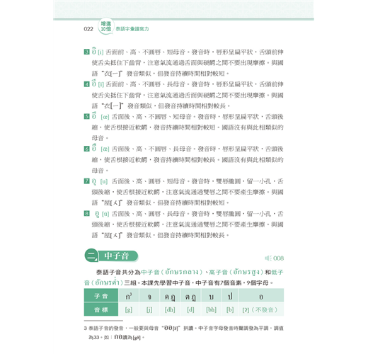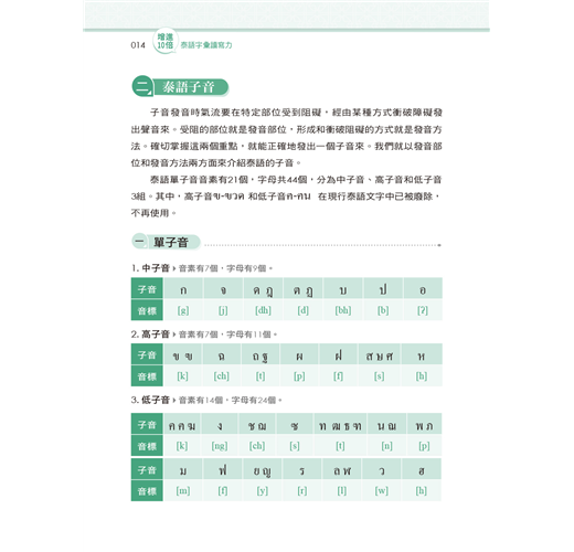 本書將帶領泰文新手,以完全不懂泰語的角度出發,從子音的中音、高音、低音三組子音字母,分別帶讀者練習聲調變化及發音方法,先從簡單的子音與母音相互拼音起,漸漸導入聲調符號及尾音,由淺入深、循序漸進地學習。