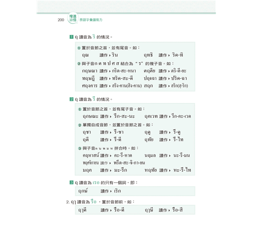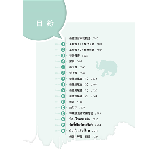16堂泰文課,其中介紹約2600個例字,依照相近音列舉詞彙串,讓大家從中累積大量拼音經驗。這些大量的單字,目的僅在於拼音、發音練習上。見字能發其音,並藉由抄寫單字增強印象,便達到我們教學的目的,並非要讀者將單字全部熟背,那就本末倒置了。