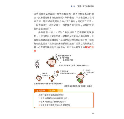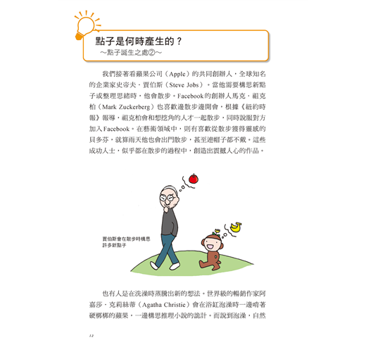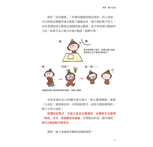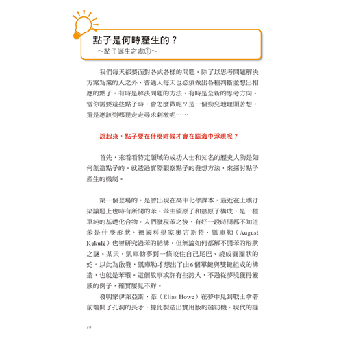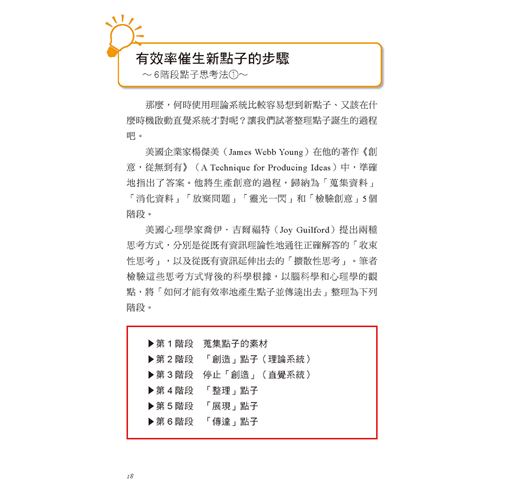 1、6階段點子思考法,讓點子輕鬆成形:從商品開發到規劃家族旅行,當我們想要「著手做些什麼」「改善什麼」時,就必須構思「點子」。然而,要讓腦海中朦朧的想法具體成形,化為他人眼中的好點子,卻是一大難題。本書將點子發想並傳達出去的過程歸納為「6階段點子思考法」,也收錄許多讓你從「睡眠」與「小酌」中創造點子,甚至靠簡報贏得支持的有趣方法。
