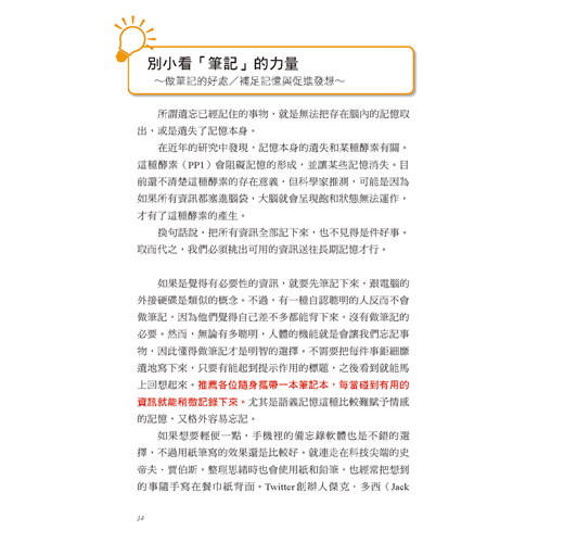 如果是覺得有必要性的資訊,就要先筆記下來,跟電腦的外接硬碟是類似的概念。不過,有一種自認聰明的人反而不會做筆記,因為他們覺得自己差不多都能背下來,沒有做筆記的必要。然而,無論有多聰明,人體的機能就是會讓我們忘記事物,因此懂得做筆記才是明智的選擇。不需要把每件事鉅細靡遺地寫下來,只要有能起到提示作用的標題,之後看到就能馬上回想起來。推薦各位隨身攜帶一本筆記本,每當碰到有用的資訊就能稍微記錄下來。尤其是語義記憶這種比較難賦予情感的記憶,又格外容易忘記。