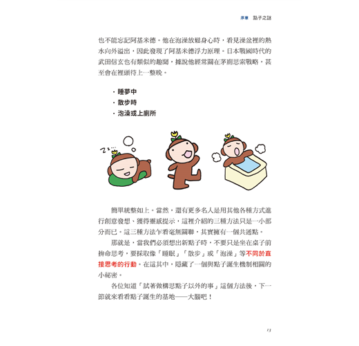 附帶一提,本書將由一群頭戴小花的猴子為大家帶路,牠們被稱為「米猴」,會藉由頭上花朵的顏色來表現情感。希望可以和牠們共同努力,成為更好的生命體。讓我們感謝米猴的協助,一起探索點子的「祕密」吧!