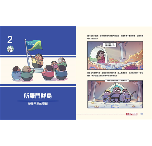 內容包含有「美麗海島的南國往事」、「所羅門王的寶藏」、「楓葉之國的歷史」、「天堂與地獄並存的巴西」、「中立之國還是牆頭草的瑞典歷史」、「大航海時代的舵手等……幾乎每一頁都有一個讓大家會心一笑的梗,同時還具有扎實的史實基礎,讓讀者在捧腹大笑中通曉一段歷史背景。