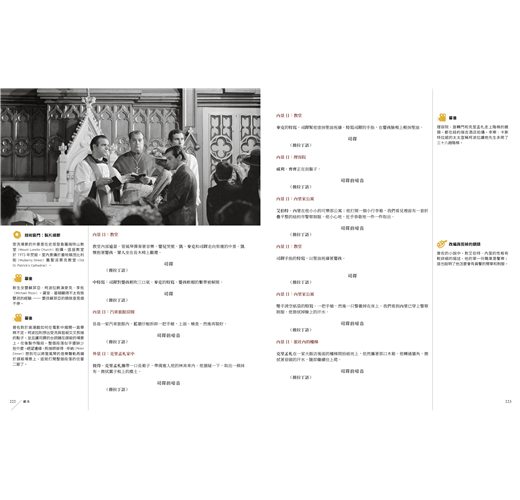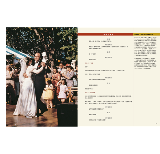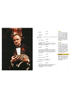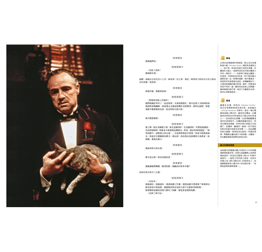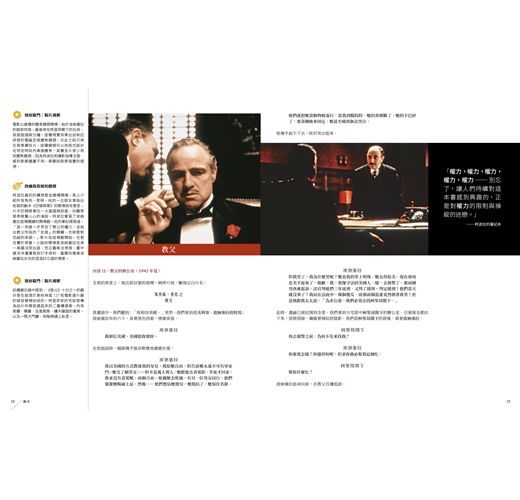 導演心法、製作秘辛與拍攝密技全數公開,柯波拉導演有一本貼著《教父》原著小說內頁,而周圍留出空白的導演筆記本,寫滿了他的創作要點與電影筆記,他稱之為「聖經」。而現在,讀者手上也有這樣一本以《教父》電影劇本為核心、周圍充滿著評註和圖解的「教父寶典」!