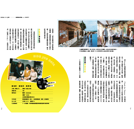 而兼業總有個開始,不如跟著兼業LEVEL的初、中、高階三個精彩案例,一探新竹「津采酒業」的精釀啤酒團隊,如何以啤酒為媒介,帶領群眾更認識新竹舊城區;一群嘉義縣市的特教老師共同組成「好槺Goody」,下班時間在朴子鄉村開一間雜貨冰店,將所學實踐在社區據點;在花蓮飯店任職、同時心繫新城崇德部落的設計總監,如何從兼職慢慢進入創業階段,繼而在部落內開了「Mhuway達吉利共享空間」。