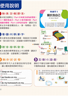 本書共有五個單元:Part 0和英文成為好朋友Let’s Get Started!;Part 1關於我自己All about Myself;Part 2我可愛的家My Lovely Family;Part 3美麗的環境What a Beautiful World!;Part 4好吃的食物Tasty Food,讓孩子從日常生活中會接觸到的人、事、物開始,浸入英語學習環境。