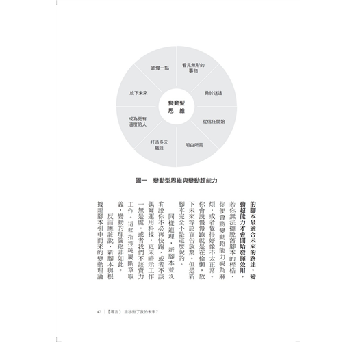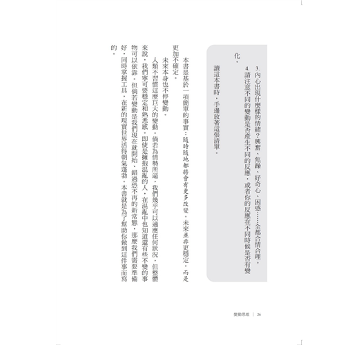 變動思維可以啟發反直觀,以適應變動。發展這些新的心態不僅對個人,也會對我們服務的企業、領導的團隊、設計的產品、建立的夥伴關係,以及最終共同創造的未來世界帶來影響。當這一切結合在一起時,將成為一張地圖,可以任你從容地駕馭未來。