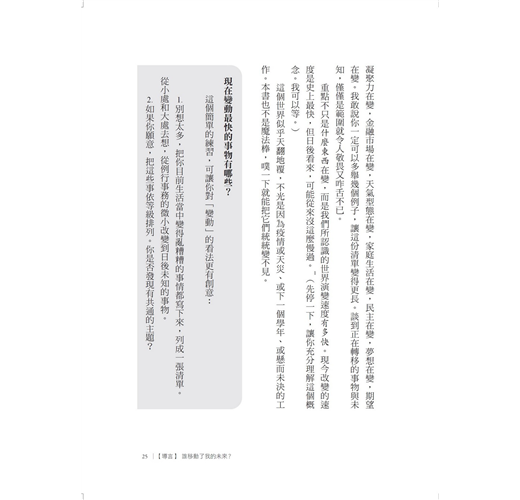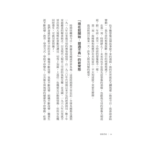 國內外各界名人推薦 自序 在快速變動世界中成功的超能力 導言 誰移動了我的未來? 「現在就開始,錯過不再」的新常態╱並非所有改變都相等╱變動的理論╱思維模式的根源:神經系統、焦慮,以及成長╱步驟一:開啟變動型思維╱步驟二:解開你的變動超能力╱步驟三:寫出你的新腳本╱我踏上變動的旅程╱通往變動的路線圖╱該怎麼讀這本書 第一章 跑慢一點 超能力:跑慢一點╱依光速前進的舊腳本╱你不是一張待辦清單╱生產力是為了什麼,又是為了誰?╱與其追求生產力,不如提升專注於當下的能力╱保護資產╱逃離自身╱慢慢地思考,晚一些做決定╱從 FOMO 到 JOMO╱什麼樣的玫瑰?╱慢慢跑:思考練習 第二章 看見無形的事物 超能力:看見無形的事物╱你的社會與文化取向決定了你如何看、看到了什麼╱檢視你的既得權利與選項╱你將其他人看成消費者,還是公民?╱空蕩蕩的空間╱學著去看╱讓無形的事物變得可見╱看見無形的事物:思考練習 第三章 勇於迷途 超能力:勇於迷途╱失落的宇宙╱迷失≠失去≠失敗╱抵換與匱乏╱脫離舒適圈,追求成長╱並非迷失,只是暫時放錯地方╱不確定的別名╱探訪未知、擁抱各種可能╱小姐,妳迷路了嗎?╱勇於迷途:思考練習 第四章 從信任開始 超能力:從信任開始╱猜疑摧毀創造力╱(過時的)規劃破壞了信任╱不平等滋生了猜疑╱古老的智慧,亙古常在的信任╱新腳本的設計源自於信任╱新腳本:傳遞信任的領導╱但是,這麼做很怪!╱我們在變動中付出信任╱從信任開始:思考練習 第五章 明白所需 超能力:明白所需╱關係緊繃的原因:過與不足╱以「明白所需」來領導╱「越多越好」的經濟學╱「越多越好」的心理學╱從「越多越好」到「明白所需」╱夠好,就很好╱明白所需:思考練習 第六章 打造多元職涯 超能力:打造多元職涯╱多元組合到底是什麼?╱從單一路徑改為多元組合╱重新定義自己的職業身分,以因應變動不居的世界╱打造多元組合╱多元職涯與未來教育:迎接終身學習╱一起合作:二十一世紀行會╱別被目前的工作內容做小了╱打造多元職涯:思考練習 第七章 成為更有溫度的人(並服務他人) 超能力:成為更有溫度的人(並服務他人)╱人性與大腦╱服務與受苦╱以陰補陽╱陰效應與浮卡╱提高數位智商╱希望與意識╱本於人性溫暖,以服務為導向╱成為更有溫度的人(並服務他人):思考練習 第八章 放下未來 超能力:放下未來╱困在過去,害怕未來╱害怕放下╱掌控:感受與現實的對抗╱新腳本:因應變動的三種轉換╱再次喚醒你的主體性╱關於變化的「問題」╱不要太擔心煩惱本身╱重新出發╱輕輕握住未來╱放下未來:思考練習 【結語】 繼續變動下去 討論指南 致謝 參考資料