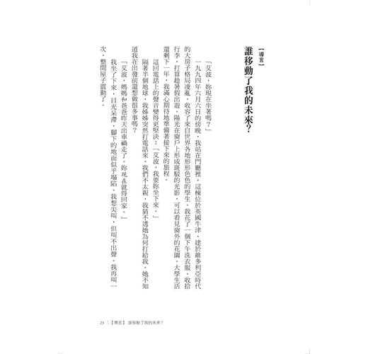 【導言】誰移動了我的未來? 「艾波,妳現在坐著嗎?」一九九四年六月六日的傍晚,我站在門廳裡,這棟位於英國牛津、建於維多利亞時代的大房子格局凌亂,收容了來自世界各地形形色色的學生。我花了一個下午洗衣服、收拾行李,打算趁暑假出遊。陽光在窗戶上形成斑駁的光影,可以看見窗外的花園。大學生活還剩下一年,我滿心期待地準備著接下來的旅程。 這回電話上的聲音變得更堅決:「艾波,我要妳坐下來。」 隔著半個地球,我姊姊突然打電話來。我們不太親,我猜不透她為何打給我。她不知道我在出發前還想做很多事嗎? 「艾波,媽媽和...