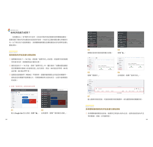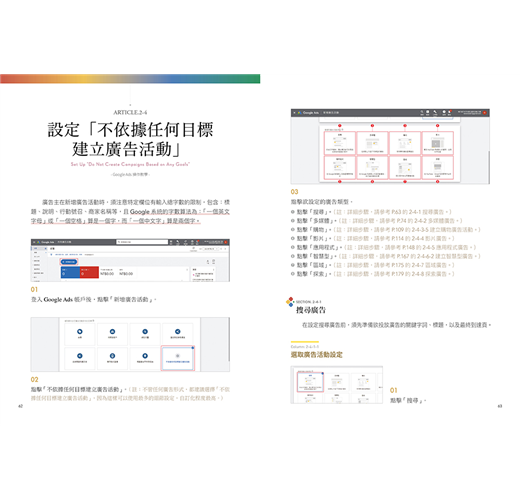 從註冊及登入Google Ads帳戶、建立專業者帳戶,到設定各種目標的廣告、追蹤廣告成效、串聯其他網站等教學,都有提供完整詳細的圖文步驟示範,就算是初學者也能跟著輕鬆操作不NG!