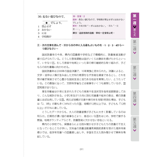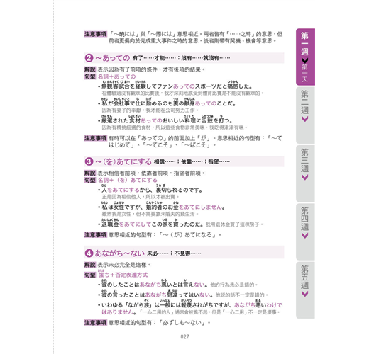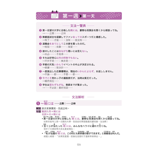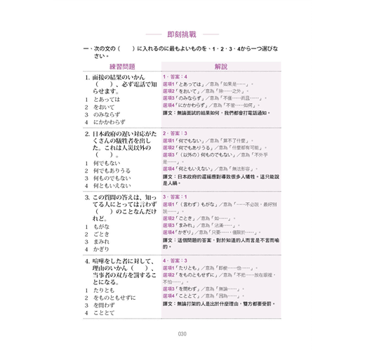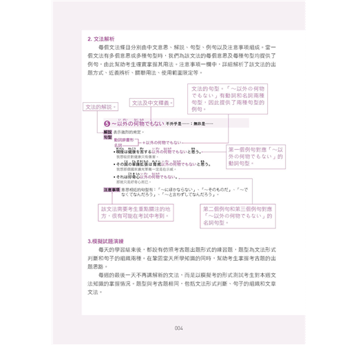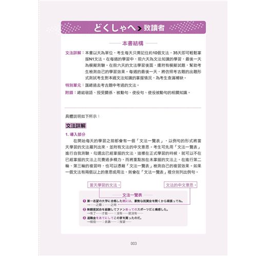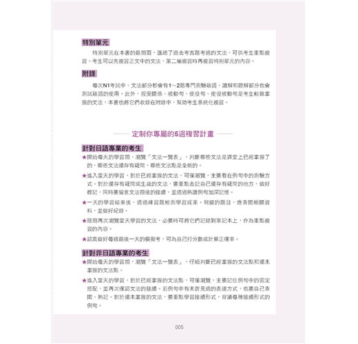 本書以35天規畫學習進程,重點文法與題目演練交錯進行。文法重點複習涵蓋解說、句型及例句,還有注意事項提醒你該文法可能誤用的地方,並與相關文法比較,一次掌握文法核心!