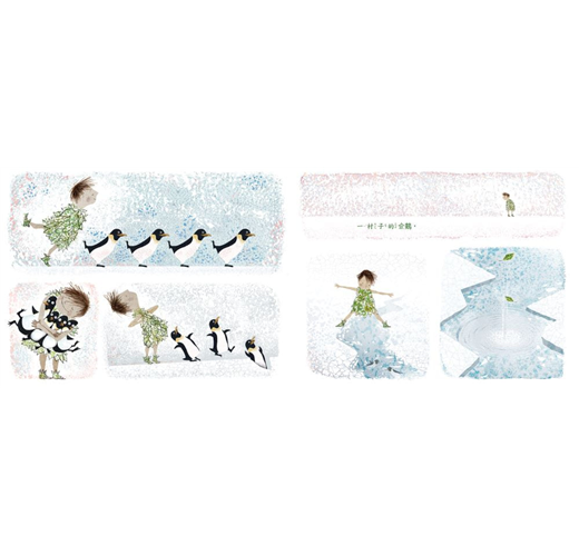 《一個部落的孩子》封面上,男孩穿著樹葉做成的衣服與小鞋子,趴在地上,面對面模仿著山羊。跟隨他的腳步,我們來到住滿山羊的高山,走進雪白極地擁抱企鵝;「噗通」潛入深海,被發光的水母包圍;接著被浮上海面的大鯨魚往上推!水柱將小男孩噴向天空,壞心渡鴉飛過啣起他,沒想到飛到一半,小男孩跌落巨石堆,一個重心不穩,又落入草叢間。一路上男孩模仿巨石的型態,跟隨大象踩著沉穩步伐,在喧鬧森林樂隊中和猩猩一起演奏。多變的自然中,他嘗試著融入不同群體,卻總是格格不入。最終,他脫下上衣,不再假裝是山羊、企鵝還是大象,不是水母也不是烏龜,而是做回真正的人類小男孩。他以最赤裸的樣貌,找到了人類部落,那裡有「一個部落的孩子」!