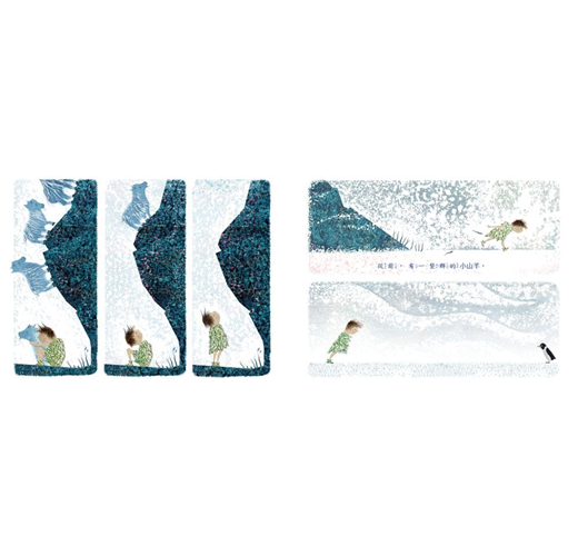 小男孩爬上高山、潛入深海、穿越冰原、深入叢林、攀上樹梢、仰望星空……但是他在路上遇見的每位新朋友,都有屬於自己的群體。只有他,總是獨自一人。他試著融入牠們,裝上羊角、學企鵝走路、學水母漂浮、坐在鯨魚背上乘風破浪、和巨石陣一起安靜待著、戴上樹葉裝成大象耳朵、揹著椰子殼混入龜群、學毛毛蟲匍匐前進。但是,這些新朋友都只能陪他一下下,沒有多久,大家就要往各自的未來前進。於是,小男孩開始做自己:一個真正的人類小男孩……你猜他找到了什麼?