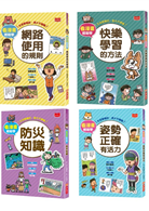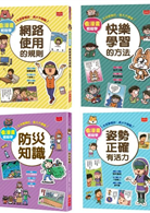 「看漫畫輕鬆學:孩子的第一套生活常規套書2」包含:《看漫畫輕鬆學:網路使用的規則》、《看漫畫輕鬆學:快樂學習的方法》、《看漫畫輕鬆學:姿勢正確有活力》、《看漫畫輕鬆學:防災知識》
