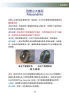 ◎書中內容從「寶石常用的儀器」介紹起,再論述寶石各 家族:鑽石、剛玉家族、石榴石家族…有系統的作深入淺出的介紹,以「精 簡洗鍊」的文字輔以「生動活潑」的圖表,讓讀者輕鬆進入大地歷經億萬年 所蘊育出美麗、燦爛的寶石世界,絲毫不覺得「寶石學」是一門艱澀難懂的 科目, 甚至一般大眾亦可將此書當作「豐富日常生活」的 寶石參考書籍。