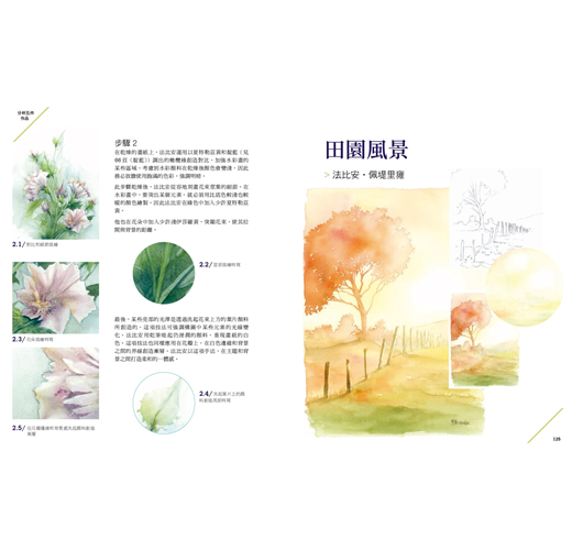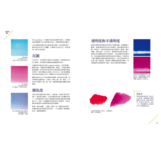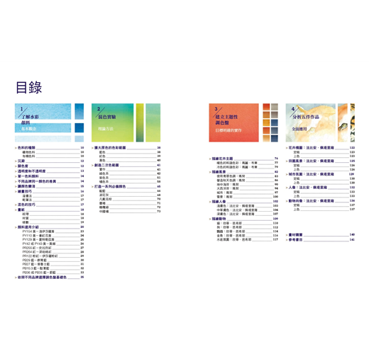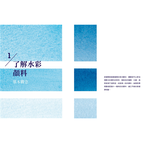並且,藉由四名水彩畫家繪製的作品,引導讀者選擇最適合的色彩,建立平衡的主題式調色盤,帶來豐富和諧的顏色。我們選擇的十一種顏色會是許多調色的基礎,但是並不會受限於此,因為也會加入其他顏料擴大色彩範圍。最後,我們將按步驟分解,詳細剖析多幅水彩畫,幫助讀者實際應用調色理論。因為若是單憑調色理論,是不足以解決在實作中容易遇到的常見技法弱點。