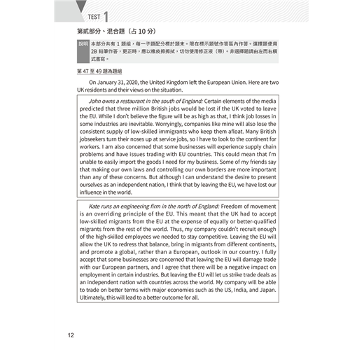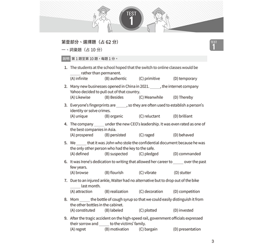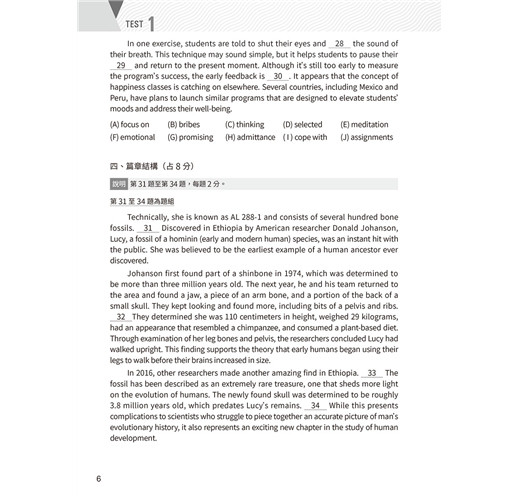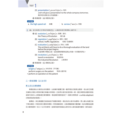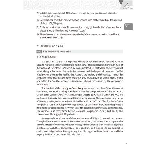 選文主題涵蓋最新話題、自然地理、歷史文化、環保科技、醫療保健……等,培養邏輯思考,獲取跨領域新知;整體難度稍高於正式考題,加倍累積作答經驗,正式應考穩操勝算。