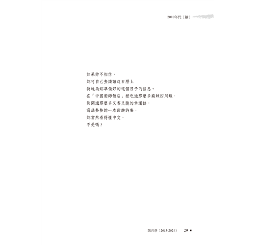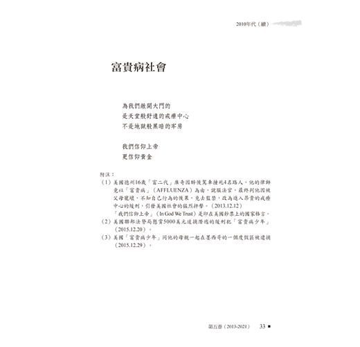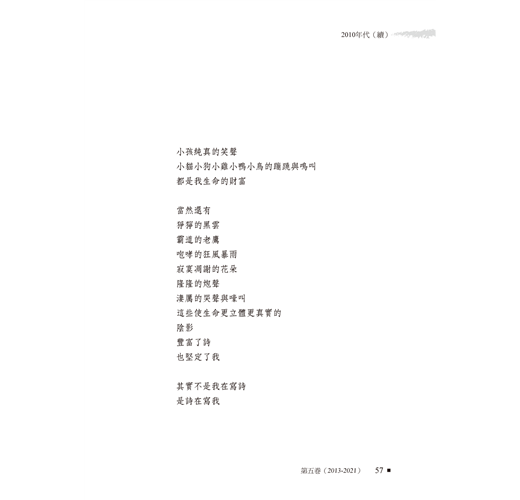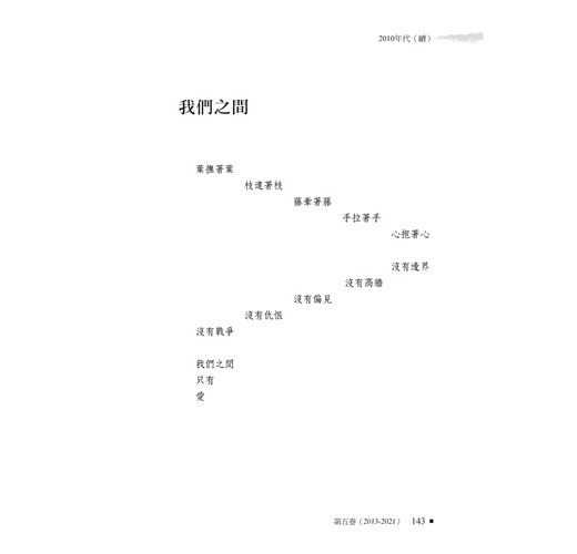 全書共兩百餘首詩作,囊括生活所觀、所感,彷彿日記般,紀錄與保存了每個當下與心情。在人際關係越來越冷漠的今天,一首好詩常會滋潤並激盪我們的心靈,喚回生命中一些快樂的時光,或一個記憶中的美景。