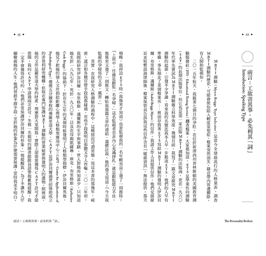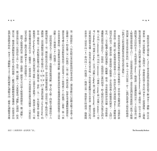 這些質疑都不是第一次出現。沒有人能解釋,為什麼有這麼多人明明知道這些質疑,卻還前仆後繼地相信人格類型,甚至帶著宗教般的狂熱捍衛它,認為人格類型神聖不可侵犯。幾乎每一家世界五百大企業與美國大專院校,以及社區活動中心、教會、伴侶渡假村、美國陸軍、海軍、中情局等單位,都使用人格類型測驗,每年受測者多達兩百萬人。「MBTI測驗就好像我的信仰。」這句話經常在認證課程中出現,就是我參加的那種培訓課程。「它幫助我找到自己。」「它改變了我的人生。」「我不再是過去那個人。」我看過很多人堅信人格類型能夠理解我們是誰:我們為什麼選擇現在的工作、為什麼愛我們愛的那些人、為什麼做出明顯矛盾的各種行為。儘管人格類型堂而皇之地將人分門別類,並且成為職場、學校、教會、政府機構、甚至家庭將官僚階級合理化的依據,這套系統依然屹立不搖。這本書想釐清這種堅定不移的信念究竟從何而來。在這個謎團的核心,有幾個關於人類存在的基本問題:什麼是人格?人格從何而來?我們為什麼熱中於將人格分類?當然,還有那個最宏大的問題:我是誰?