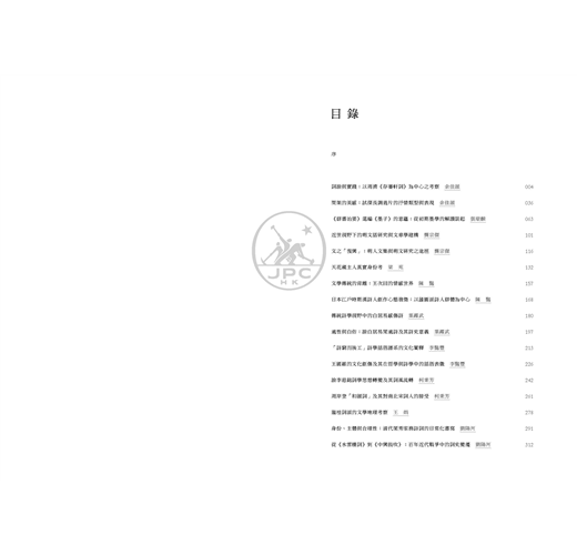 本書是香港浸會大學孫少文伉儷人文中國研究所成立十週年的紀念文集,共收論文十七篇,作者來自海峽兩岸,都曾在人文所學習、進修或工作。各篇論文的研究範圍從先唐下逮晚清,對象包括詩、詞、小說、文學批評等諸多範疇,體現了開闊的視野和宏大的格局,係人文所辦所宗旨「文史兼匯,中外貫通;整合傳統,融鑄新知」的具體展示。