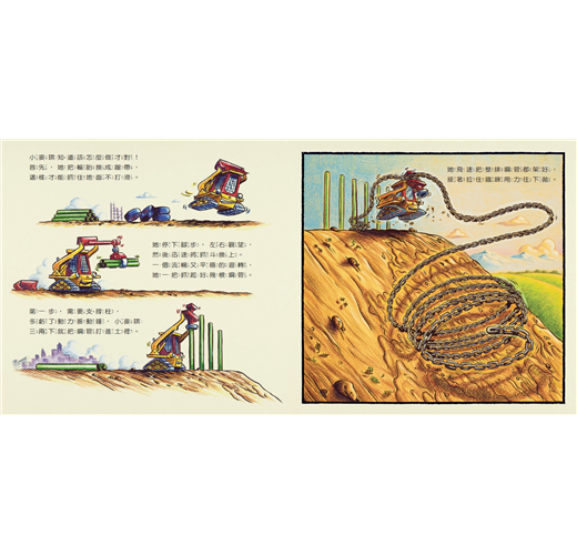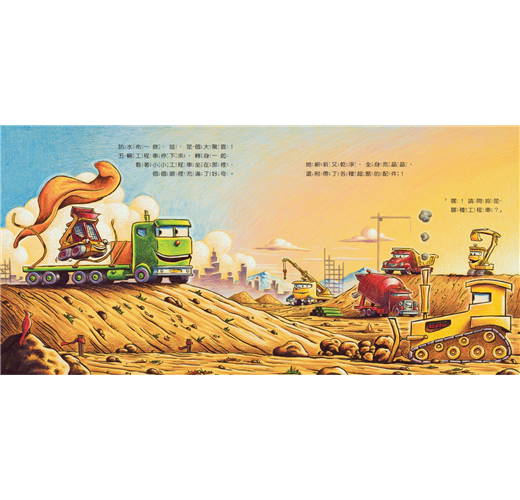 一大清早,在蓋房子的工地裡,起重機、混凝土拌合車、傾卸卡車、推土機和挖土機已經開始努力工作!平板貨車載來小小工程車加入團隊,她嶄新又乾淨,全身亮晶晶,還附帶了各種超酷的配件!她是鏟裝機——小麥琪!
