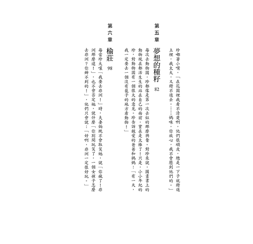每次去動物園,珍都像是第一次去似的那麼興奮。對珍來說,圖畫書上的動物現在都活生生的站在自己的面前,實在是太棒了!只是,小小年紀的珍,對動物園有一個很大的意見。珍告訴親愛的爸爸和媽媽:「有一天,我一定要去一個沒有籠子的地方看動物!」