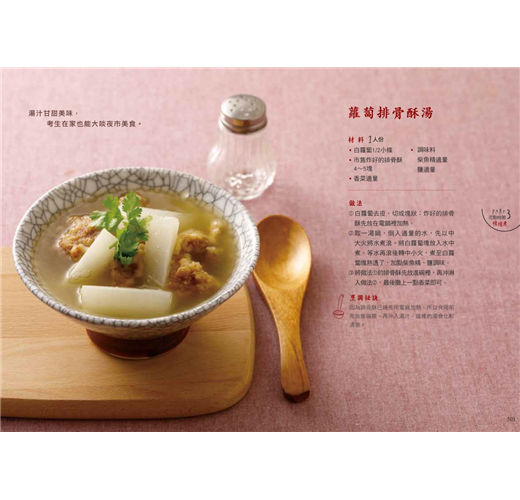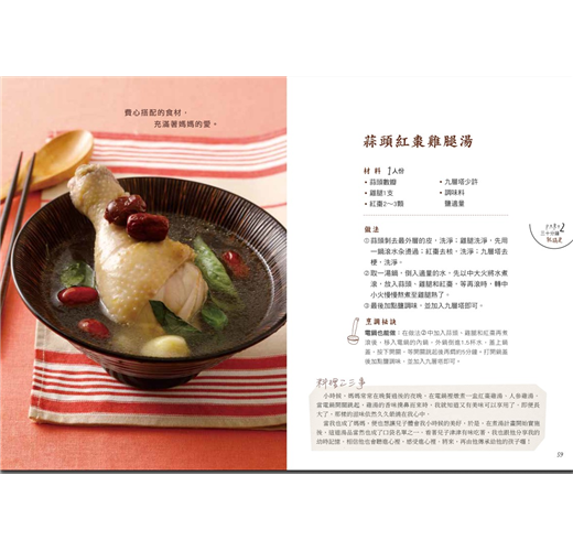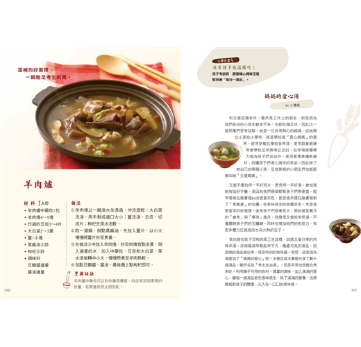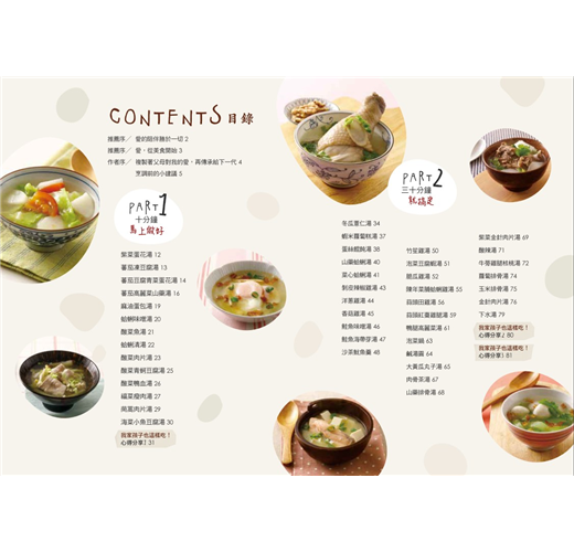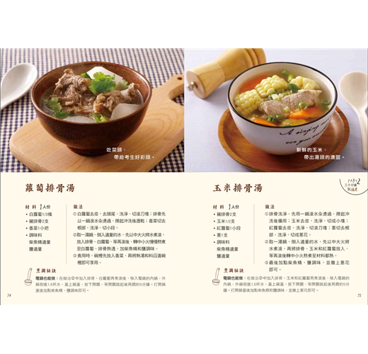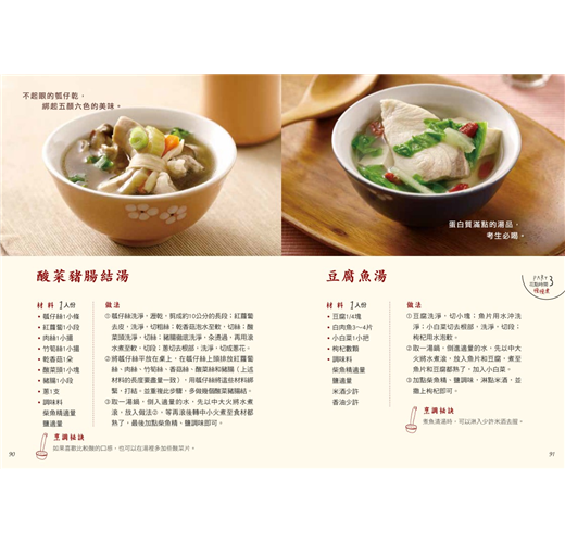 書中以烹煮時間區分單元,即便是初下廚的新手爸媽或是忙碌的家長,都能挑選出適合的食譜,親手為考生孩子端出熱湯,為他們加油、打氣。相信即將面臨考試壓力的孩子們,也能感受到家人滿滿的關懷與情感。