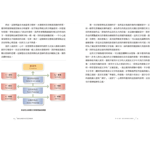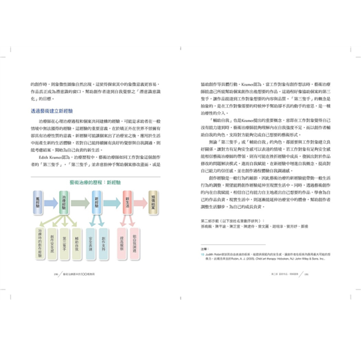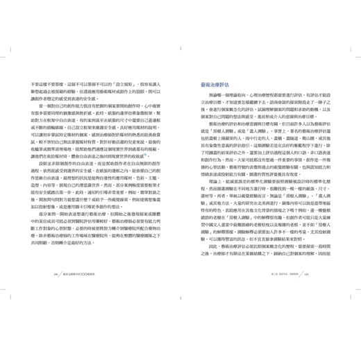 書中篇章層次分明:藝術能應用於治療、現象學方法之應用、四個濾鏡與其應用、強調美學觀點的藝術評論與其應用、藝術治療與諮商會談、圖解藝術治療歷程⋯⋯等等。