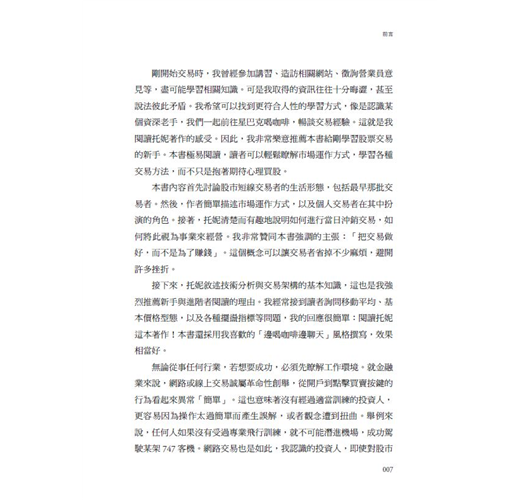 剛開始交易時,我曾經參加講習、造訪相關網站、徵詢營業員意見等,盡可能學習相關知識。可是我取得的資訊往往十分晦澀,甚至說法彼此矛盾。我希望可以找到更符合人性的學習方式,像是認識某個資深老手,我們一起前往星巴克喝咖啡,暢談交易經驗。這就是我閱讀托妮著作的感受。因此,我非常樂意推薦本書給剛學習股票交易的新手。本書極易閱讀,讀者可以輕鬆瞭解市場運作方式,學習各種交易方法,而不只是抱著期待心理買股。