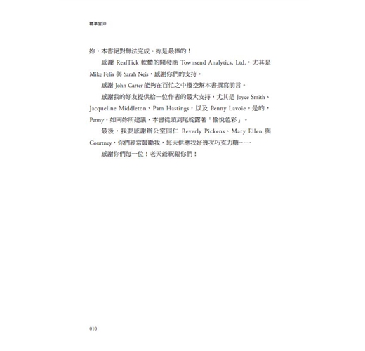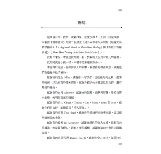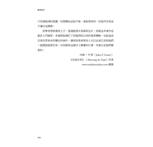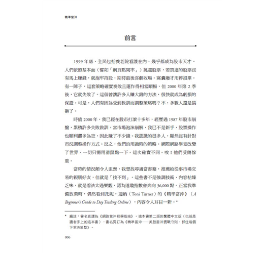 當時的情況頗令人沮喪,我想找尋適當書籍,推薦給從事市場交易的親朋好友,但就是「找不到」。這些書不是強調技術、內容枯燥乏味,就是看法太過樂觀,認為道瓊指數會奔向 36,000 點。正當我準備放棄時,偶然看到托妮‧透納(Toni Turner)的《精準當沖》(A Beginner’s Guide to Day Trading Online),內容令人耳目一新。*