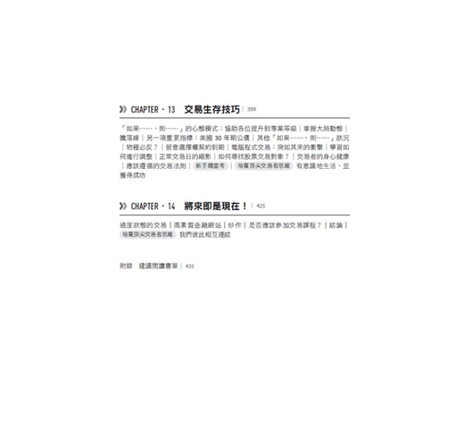 接下來,托妮敘述技術分析與交易架構的基本知識,這也是我強烈推薦新手與進階者閱讀的理由。我經常接到讀者詢問移動平均、基本價格型態,以及各種擺盪指標等問題,我的回應很簡單:閱讀托妮這本著作!本書還採用我喜歡的「邊喝咖啡邊聊天」風格撰寫,效果相當好。