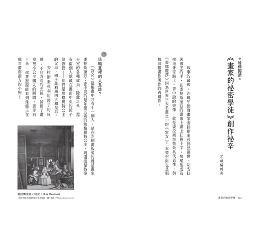 本書透過委拉斯奎茲的各幅知名作品及史料,如《教皇英諾森十世》、《持扇的女人》以及各種菲利浦四世與侏儒、弄臣的畫像,加上作者的想像,生動且深刻的捕捉、描寫這位偉大畫家的事蹟,拉近讀者與藝術的距離。不僅故事感人至深,跟隨劇情一幅幅追溯大師的繪畫足跡,彷彿超越時空,帶領讀者身歷其境的進行了一場大師名作巡禮。