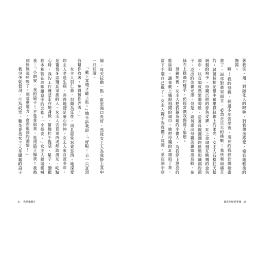 我很快就發現,生為奴童,難免會被女主人拿闔起的扇子敲手,那突如其來的一擊,經常痛得我眼睛泛淚。偶爾,她又會突然轉身,幫我把頭巾擺正,疼惜的捏捏我的臉,彷彿我跟她的棕白色小斑狗托托沒什麼兩樣。女主人有時會把托托綁起來,有時又會去抱抱牠。