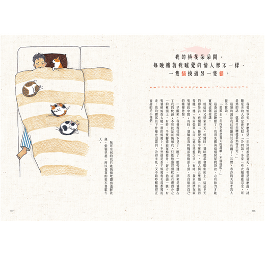 對作者來說,貓是如同家人般的溫暖存在,讓空間的溫度都變得不同了。即使跟貓說話完全不被搭理、打噴嚏時被貓喵叫抗議、不斷費心更換貓糧口味以符合每隻貓咪不同的喜好……,這些繁瑣的事情、又或是被貓咪以看似「無情」的方式回應,都是他最幸福而甘之如飴的日常。只要看到貓咪靠過來撒嬌討摸的模樣、被牠們舔著自己的手或臉(甚至還有額頭!),內心便獲得療癒與滿足。