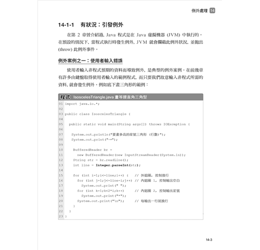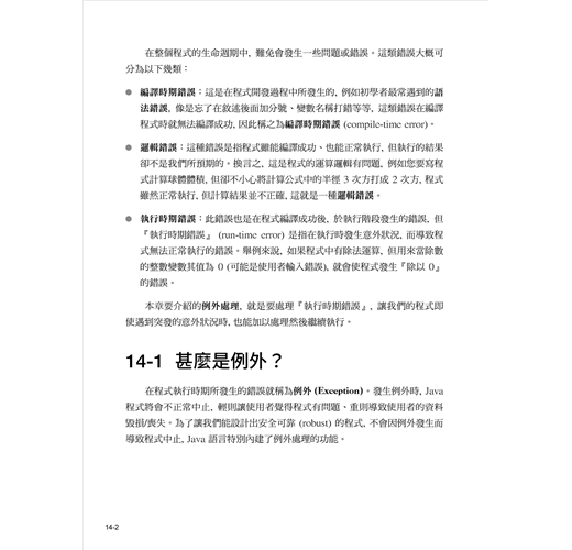 除了基本語法和觀念外, 也涵括了字串的規則表示法、Varargs 可變參數、基本型別的自動封箱 (Auto Boxing) 與拆箱 (Unboxing)、static 成員、抽象類別、匿名類別、Lambda 運算式、多執行緒、Collection 類別庫、Java AWT/Swing 圖形介面設計、2D 繪圖等實用主題。