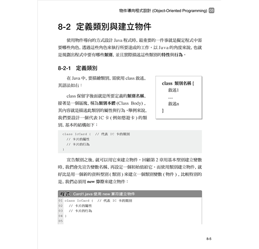 Java 是物件導向的程式語言, 學習正確的物件導向觀念非常重要, 本書在介紹類別、物件、繼承、介面、套件、類別庫、集合等主題時, 均特別著重觀念的解析與釐清, 並引用各種實例來演示及驗證所學, 以確保能學會最紮實的物件導向觀念。
