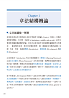 帶領讀者熟悉文章架構的大方向,接著逐一示範開頭、發展、結尾的寫作重點。除了介紹描寫文、敘述文、說明文、論說文這4種文體的特性,更進一步分析10種搭配的組織方式,例如時間順序、因果關係等。只要跟著全書安排紮實演練,讀者很快就能獨立擬定大綱,運用小技巧快速組織出文章主體。就算還沒有高超的修辭技巧,也能寫出一篇結構完善、邏輯清楚的文章。