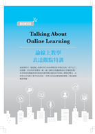 更重要的是,現今已有不少雙語種子教師被學校要求須通過標準化英檢認證(TOEFL / IELTS 等)以證明具備 B2 或以上的英語能力。(或是學生至少須具備 A1 以上的英語能力等。)而這些英檢考試不免會包括口說與寫作的評測,著眼於此現狀,本書更特別規劃了 “BONUS” 單元,以「討論線上課程利弊」為主軸,歸納出口語討論與意見書寫的範例。