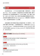 透過這種情境式學習,讀者不只在閱讀本書時吸收效果更好,還可以在平時以聽眾身分參加學術會議時,更有能力觀摩學術會議流程與台上的講者所使用的語言、視覺輔助、肢體動作等細節,讓參加會議不只是看熱鬧,還能看門道。畢竟每個人上台發表研究成果前,都在台下看了無數次別人的口語報告,向好的講者學習,提醒自己避免某些講者所犯的錯誤,都是提升自身口語報告能力的養分。