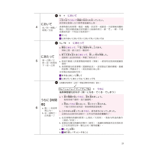 本書收錄的文型以「情境」分類,並清楚簡潔的標示出「文法的水準」、「文法意義」、「中文翻譯」、「文法的常見句型架構」、「同義文法或是其他形式」、「例句」,可說是把所有必需的資訊全部集合在一本書之內,無論是考前準備的迅速複習,或是平常學習的記憶回復,都非常的有幫助。