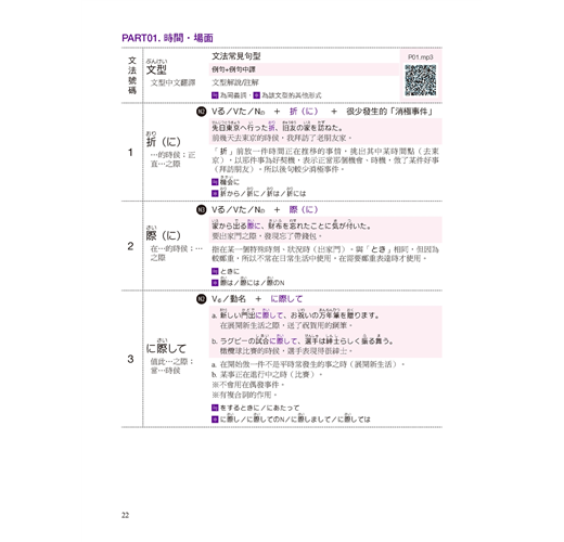 ★情境分類:文法以各種情境來分類,方便記憶大概的用法、意思,需要的時候也能夠當作文法字典使用。