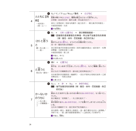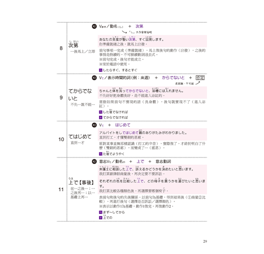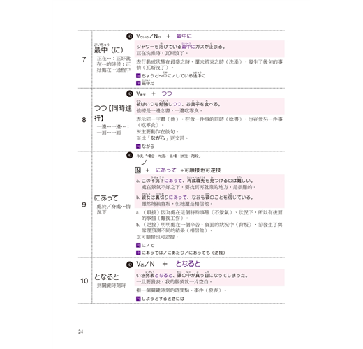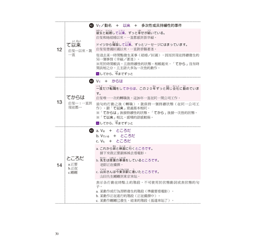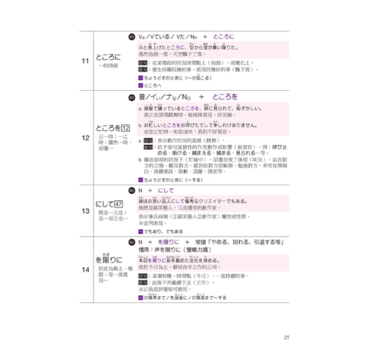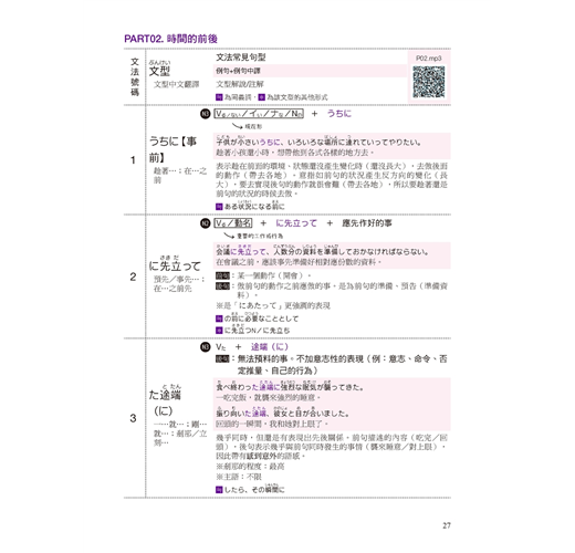 ●每個文法簡潔的列出考試需要的所有資訊,一眼掌握中高級文法