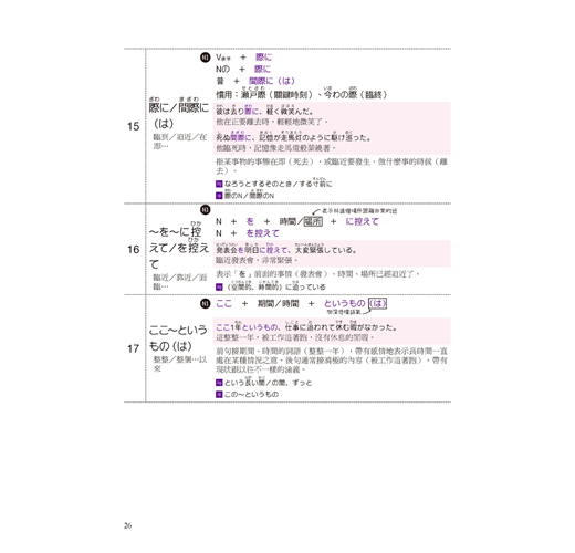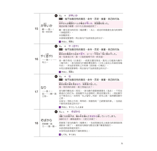 本書收錄的大量文法全部整理在隨書附贈的索引之內,以五十音順排列,可以馬上查到該文法的是在哪一頁,以及其文法的中文翻譯。