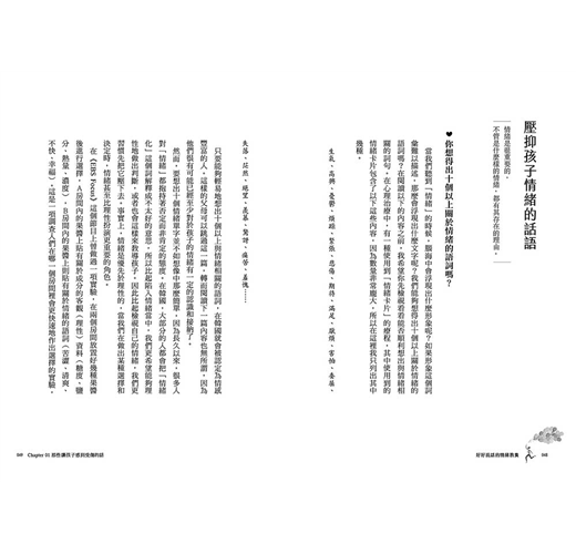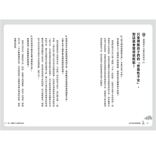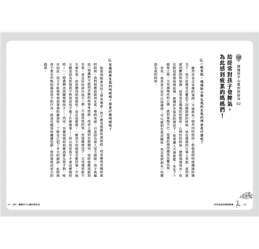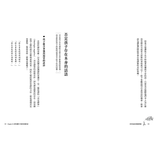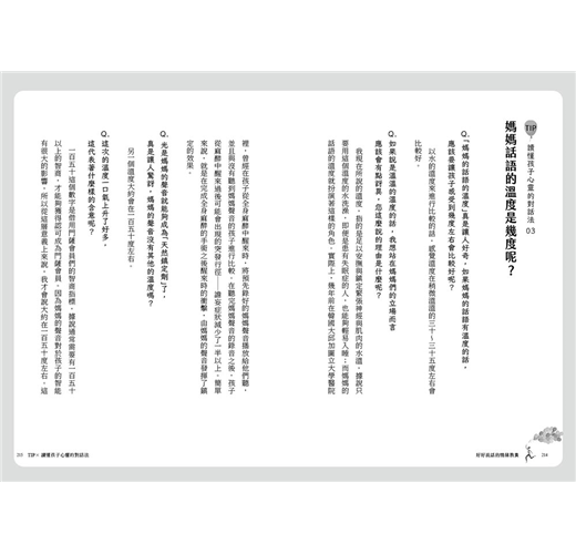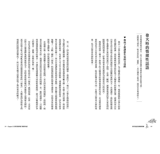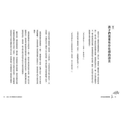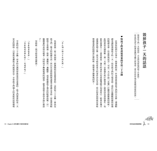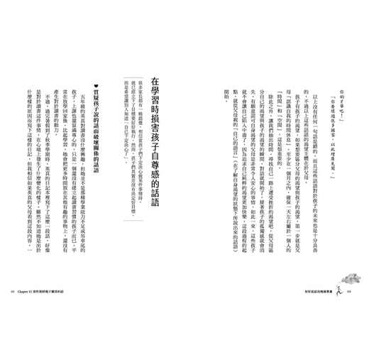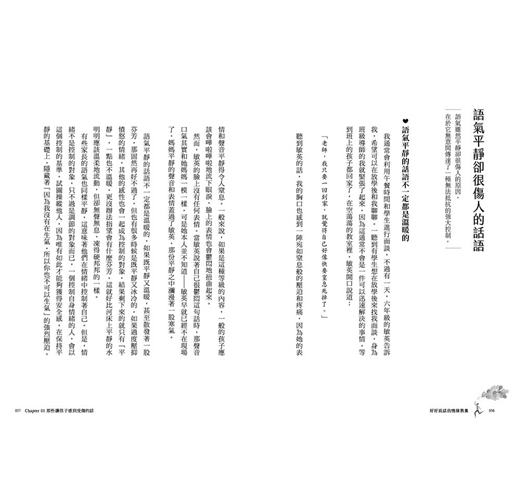 3.作者文筆簡練、文章篇幅適中,以大量例子進行說明,實際探究原因並帶到父母應如何給孩子正確觀念,除了「說話術」的層面,還有許多議題和細節值得深思。