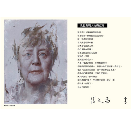 敏感的畫家為此特別畫下〈白色的梅克爾〉,配上文茜的詩,希望給大家一份愛與使命的禮物。