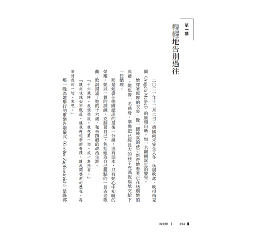 二○二一年十二月二日,德國尚未完全入冬,秋風吹起,吹得梅克爾(Angela Merkel)的臉頰白晰,如一名剛剛誕生的嬰兒。