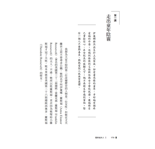 他們都有著悲傷或是挫敗的成長故事。羅斯福夫人在羅斯福得了小兒麻痺症後,當他的眼、他的腳,探訪貧民窟、童工、田納西水壩工人……並且不忘記以自己的名字繼續撰寫專欄。她出生貴族世家,但總是衣著隨意,當上總統夫人後,沒有名牌、沒有珠光寶氣,還告訴隨扈,你們穿著如此挺拔,別太靠近我,他人會以為我是你們的女僕。